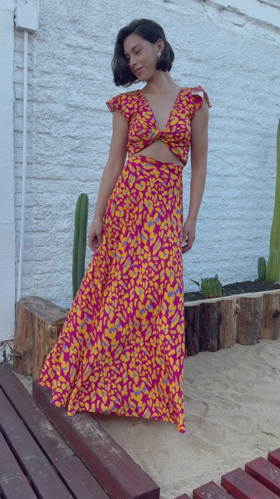 Este espectacular conjunto de dos piezas animal print combina lo salvaje con lo femenino en una explosión de color fucsia y amarillo, perfecta para robar todas las miradas.