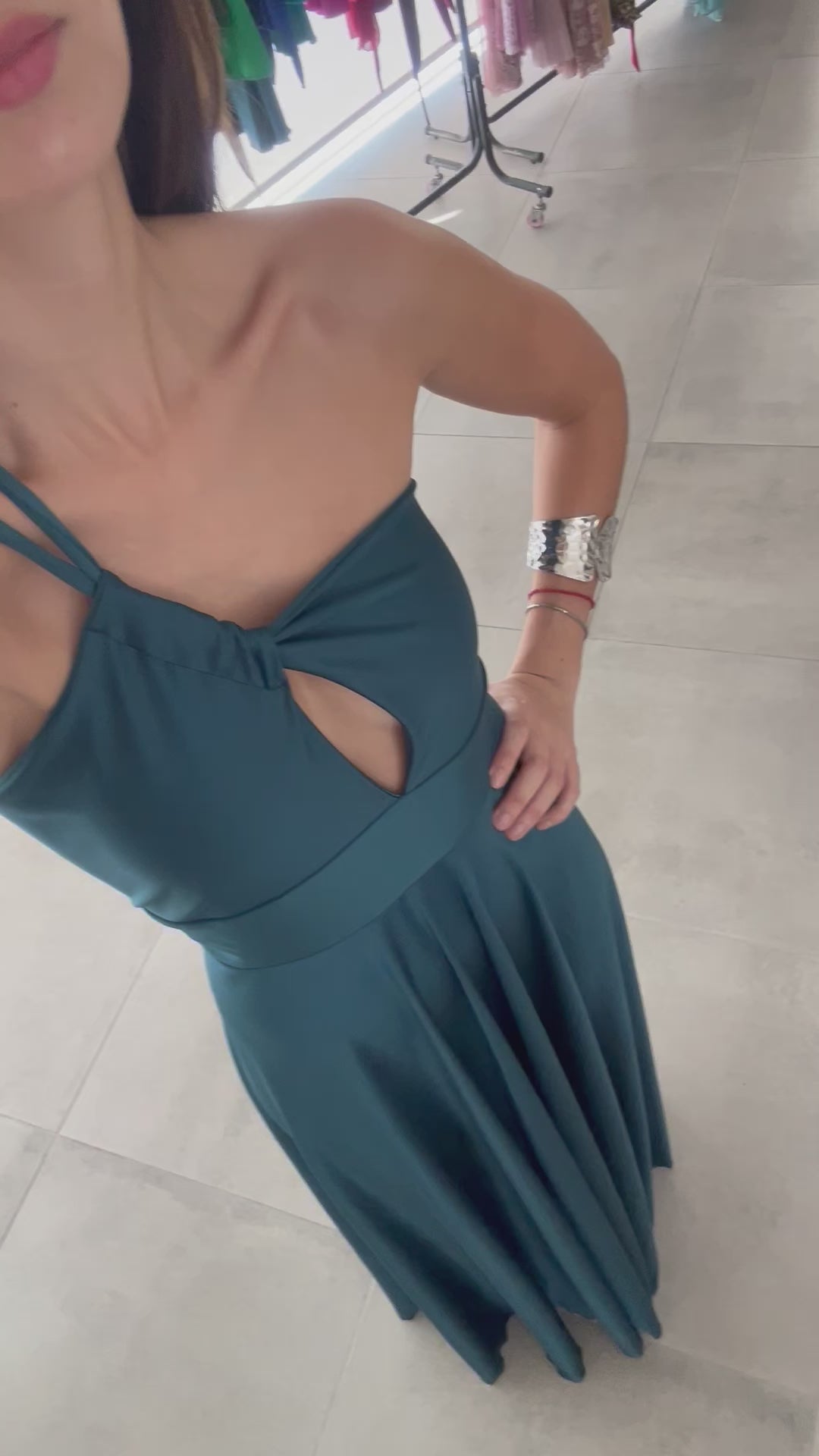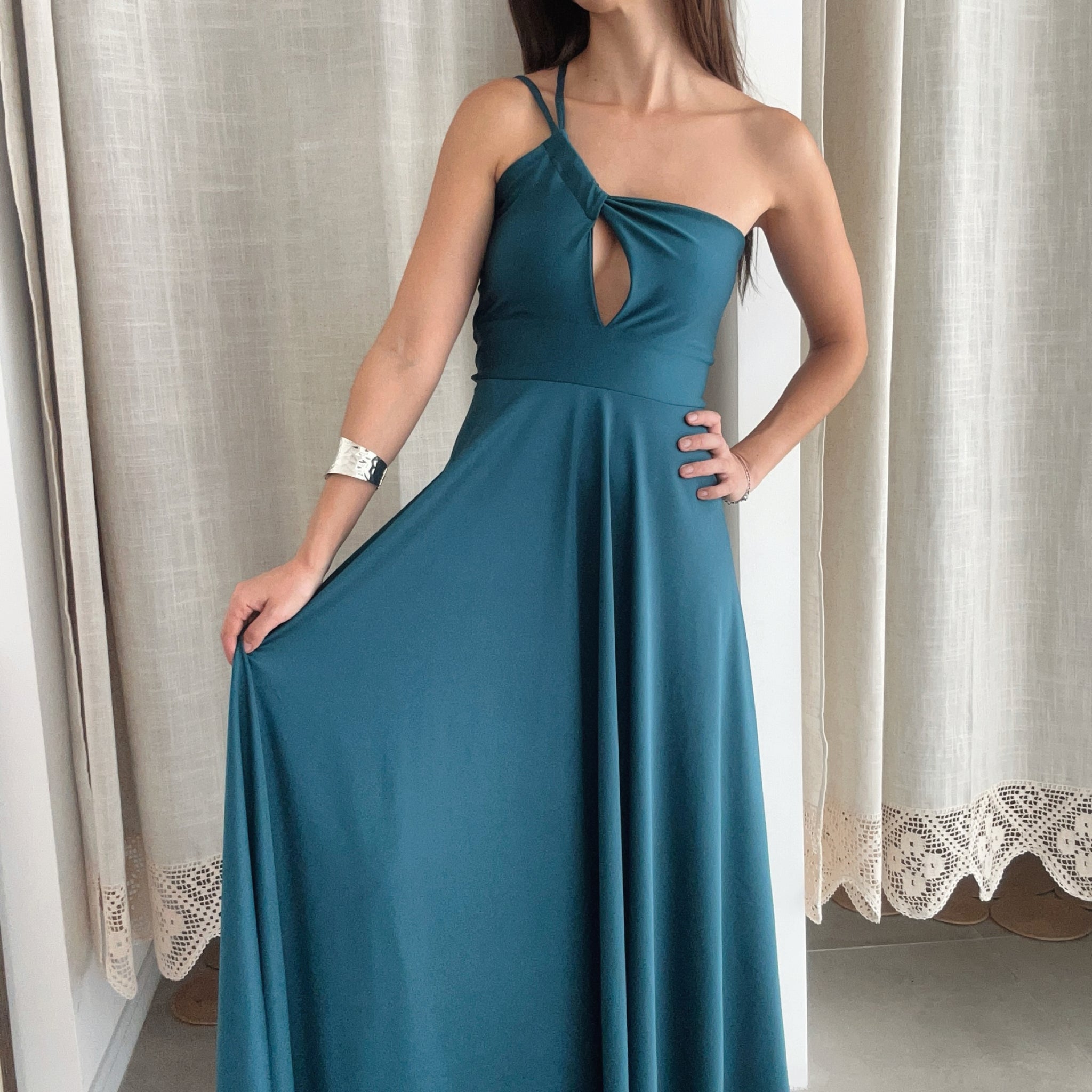 Este vestido largo asimétrico, de caída elegante y pesada, está confeccionado en lycra Dupont, lo que le da un toque de sofisticación y comodidad. El corte en la cintura resalta tu figura, mientras que las tiras ajustables ofrecen el ajuste perfecto. Hecho en Chile, es ideal para galas, graduaciones o matrimonios.