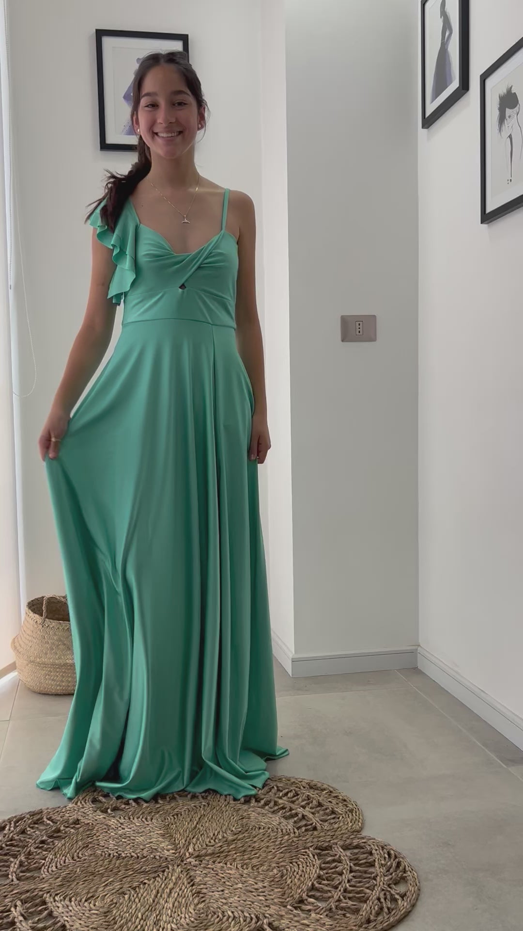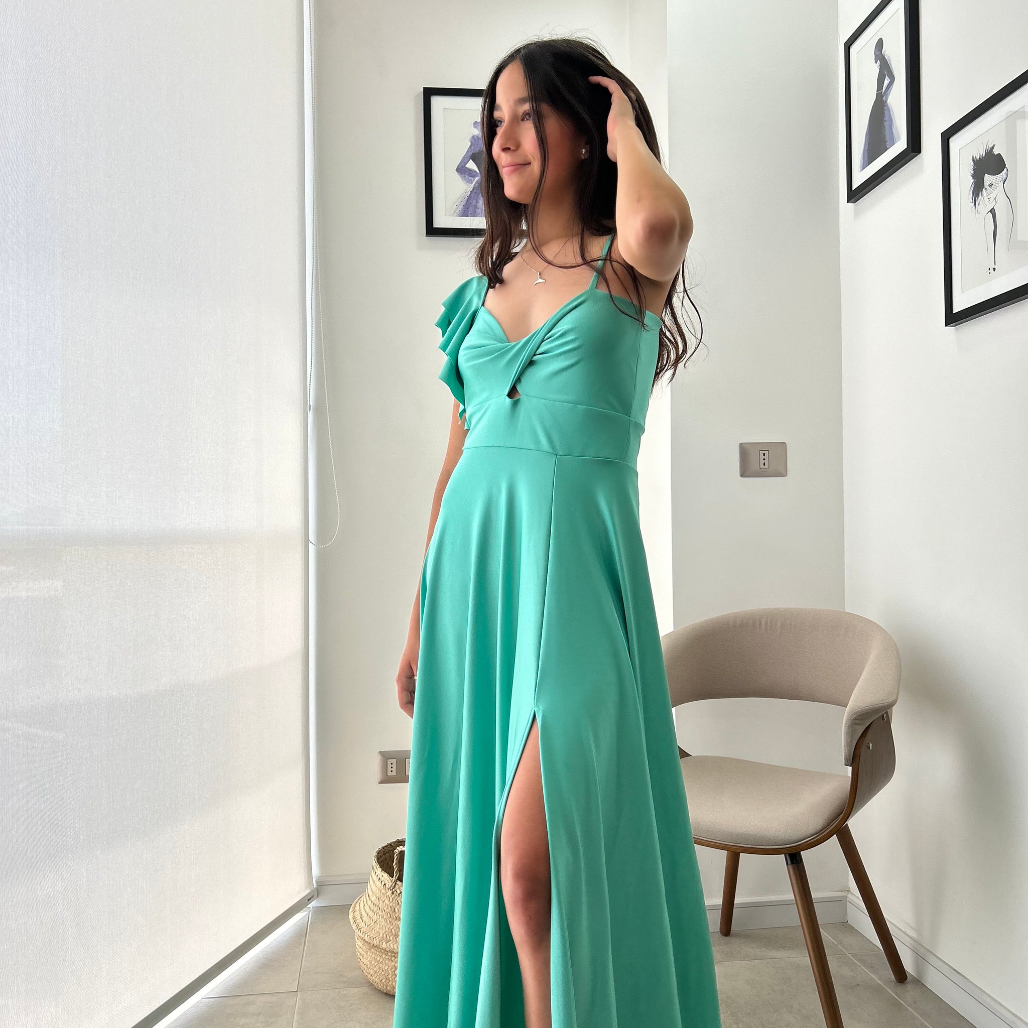 Largo, asimétrico y con ese tajo en la pierna que te da poder con cada paso. El vuelito en un solo hombro le suma movimiento y actitud, mientras el nudo en el busto realza lo justo, sin apretar. Hecho en Lycra Dupont, se siente firme pero cómodo, marcando donde debe y disimulando donde quieres.